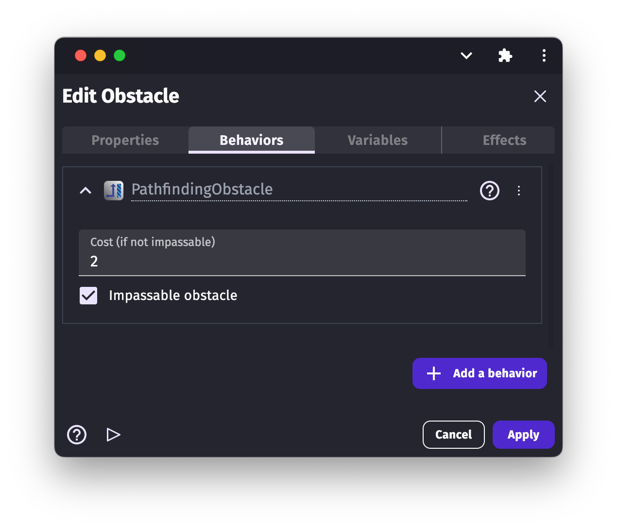 Choose which objects to avoid: the "Obstacle for Pathfinding" behavior