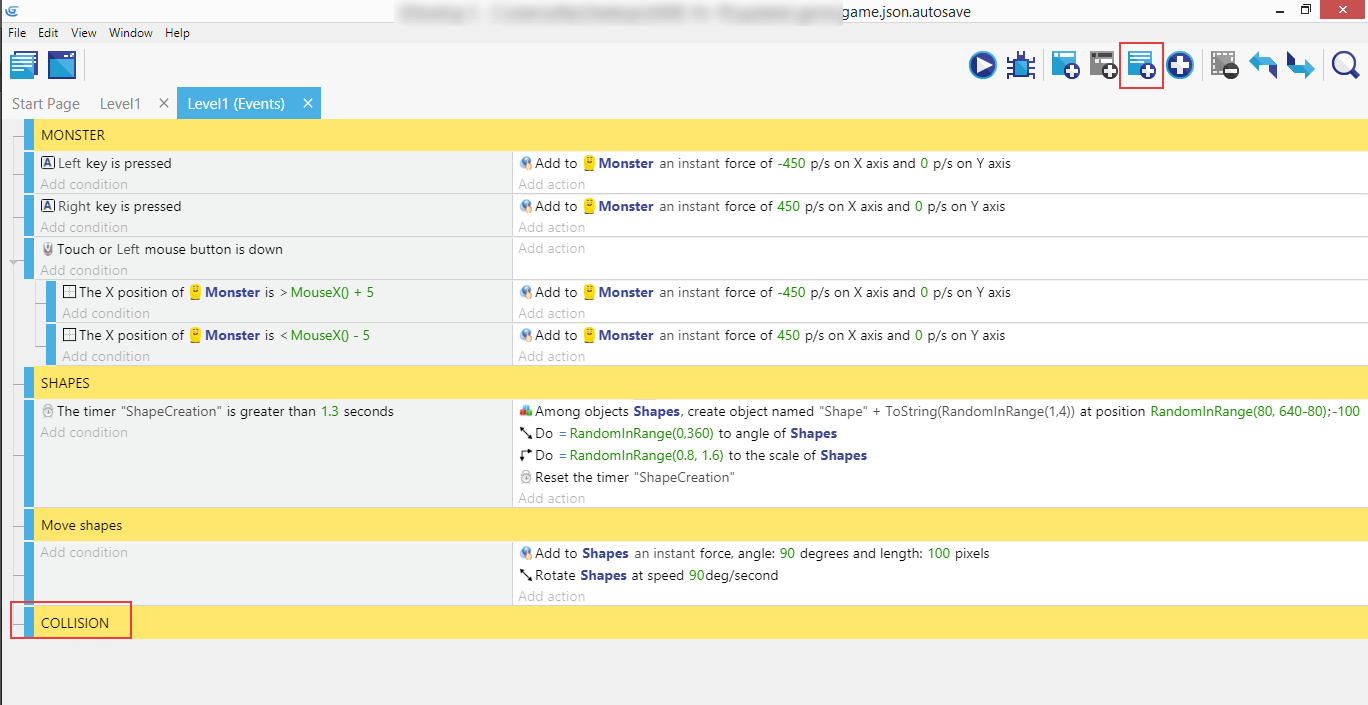 As always, make sure "Shapes" are selected, then look for "Collision" (which will test the collision between two objects). In the right panel enter the "Monster" and click "Ok".